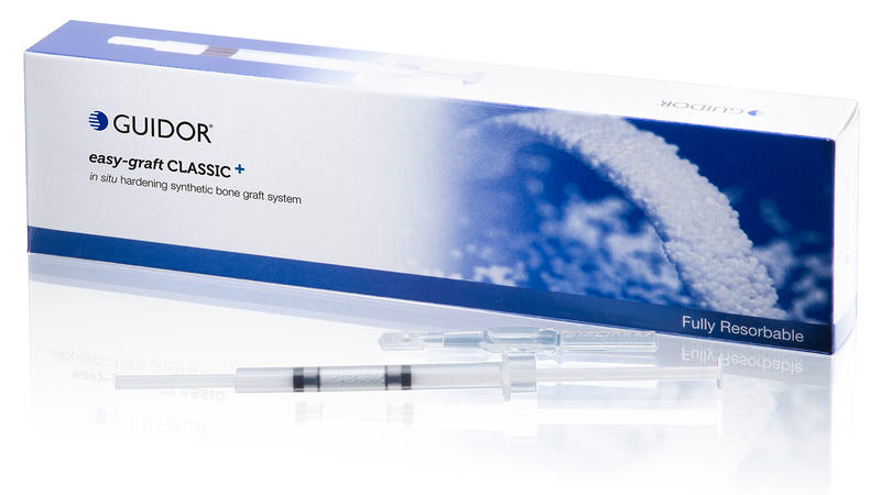 GUIDOR* easy-graft ist ein beschichtetes synthetisches Knochenersatzmaterial. Nach Zugabe des mitgelieferten BioLinkers (Aktivator) bilden die Granulate eine modellierbare Masse, die direkt aus der Spritze appliziert und an die Defektkontur angepasst werden kann. Bei Kontakt mit Blut härtet das Material zu einem porösen Formkörper aus, der Raum für die Knochenregeneration zu Verfügung stellt.